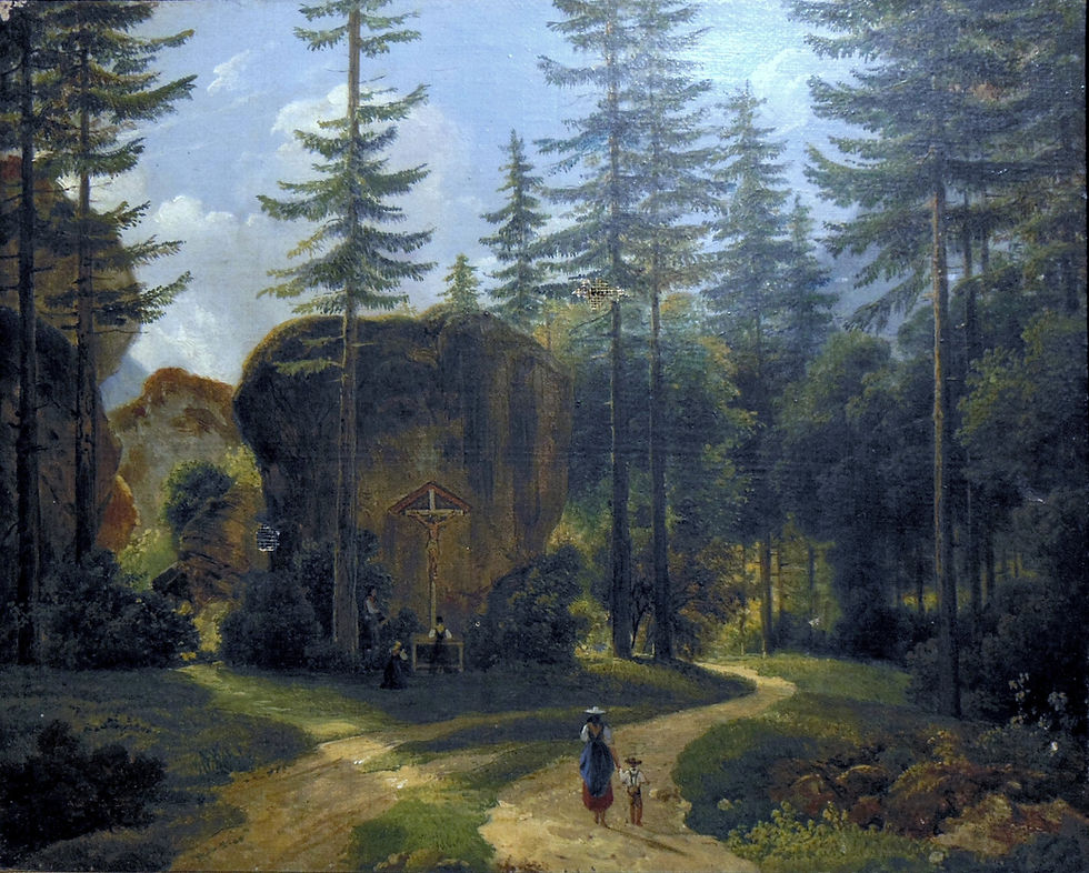 schlummernden Natur in den Schoos gestreut habe, und mochte eben seines kranken schwachen Mütterleins gedacht haben, und ihrer Äußerung im strengen Winter daß sie glaube, der himmlische Vater würde ihr noch einmal ihre Kräfte zurückgeben und sie stärken, auf daß sie nicht länger ihrem Martin zur Last fallen dürfe, wenn sie nur Blumen sähe, und sich in einem kleinen Gärtlein schaffend, an der wiedererwachten Erde und ihren süßen Gaben erquicken könnte,– als er mit einem Male stille stand, und staunend den Blick erhob; denn was er sah, rief ihm wie mit mächtiger Gottesstimme zu, und hieß ihn stille stehen und einen Gedanken ergreifen, einen Plan fassen. Losgerissen durch des Wintersturmes riesige Macht, lag mitten im Thale an einer breiten Stelle desselben ein Steinkoloß von wenigstens drei Klaftern Höhe und einem Umfang von vielleicht zwölf bis fünfzehn Klaftern. Staunend starrte